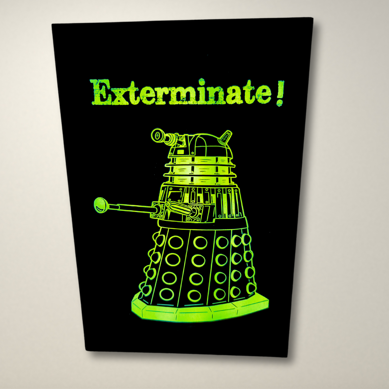 Design is of a Dalek with the words "EXTERMINATE" above